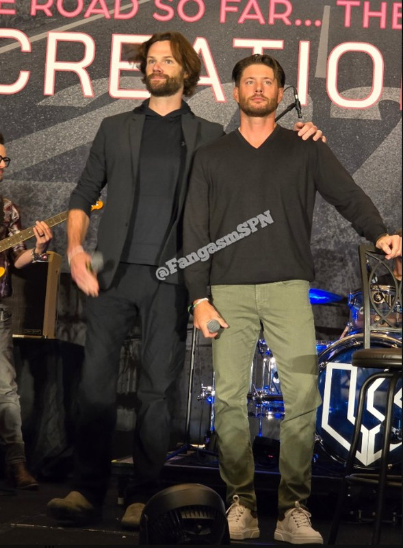 Да, Джаред рассказал, что Шеп его ловит на том, что он имеет привычку говорить "минутку", и Шеп буквально начинает считать, прошла ли уже минута или нет, и ему теперь приходится следить за речью и выбирать другие формулировки. Дженсен сказал, что в четверг перед коном гулял с детьми и, несмотря на предупреждение Дани, накормил их сладким (мороженым). Ужин был сорван, дети носились по дому, Даня ему попинала. Зато Джей Джей, зная. что отец уезжает, сделала ему браслетик "лучший папа", и Дженсен поднял руку, его показывая залу.