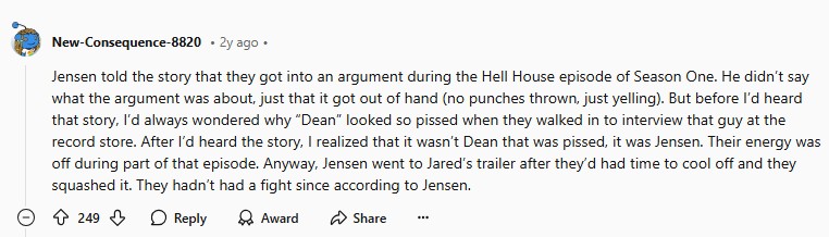 12.11.2024 в 11:43Я где-то год назад читала на тумбе, что возможно именно в этой серии была ссора Джеев, потому что в магазине пластинок у Дженсена и голос и лицо не соответствуют сцене. Так что нет, в фандоме это давно заметили, а не когда Дженсен сказал.